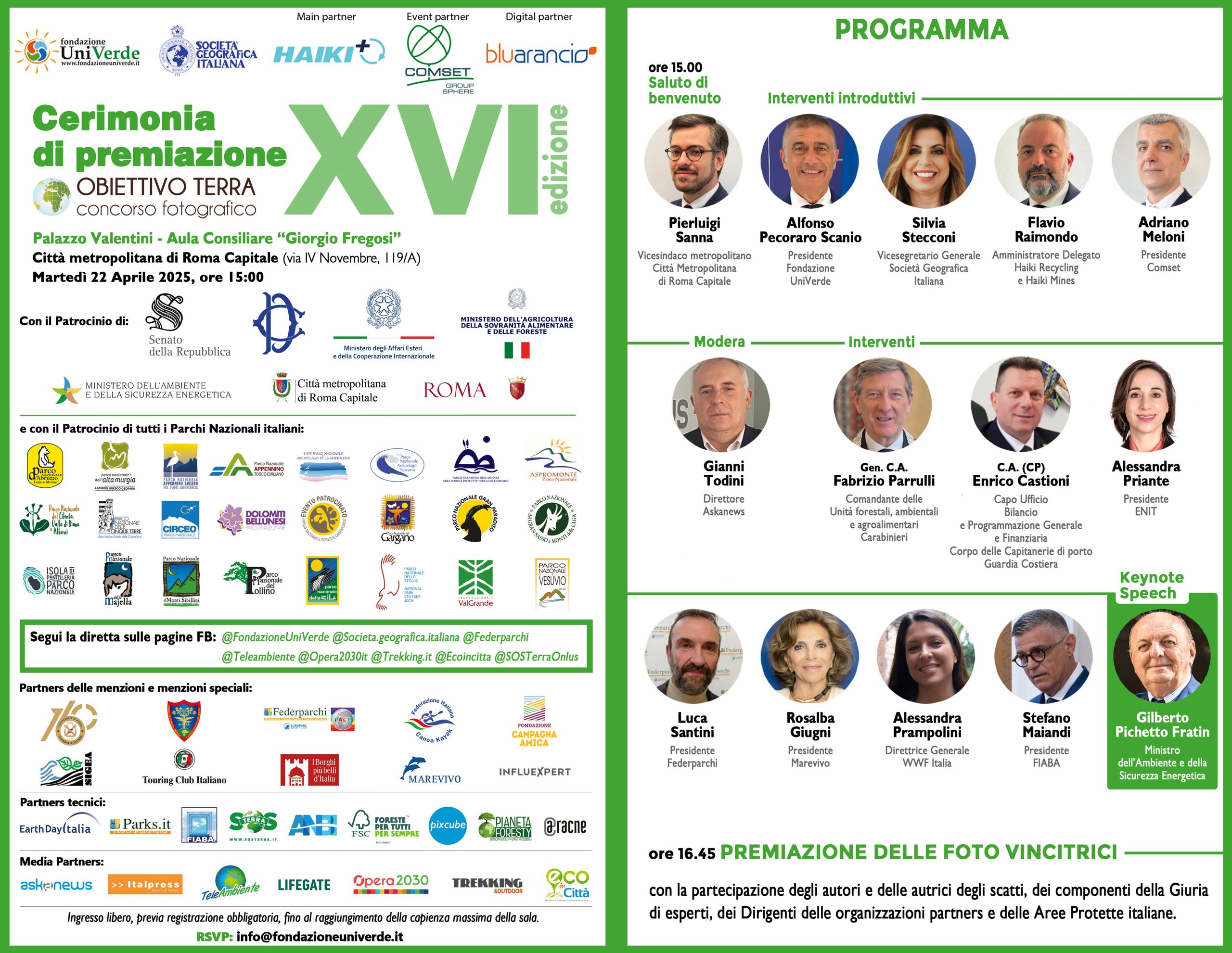 L’edizione 2025 di “Obiettivo Terra” ha ricevuto il patrocinio di: Senato della Repubblica; Camera dei Deputati; Ministero degli Affari Esteri e della Cooperazione Internazionale; Ministero dell’Agricoltura, della Sovranità Alimentare e delle Foreste; Ministero dell’Ambiente e della Sicurezza Energetica; Città Metropolitana di Roma Capitale; Comune di Roma e di tutti i Parchi nazionali italiani.