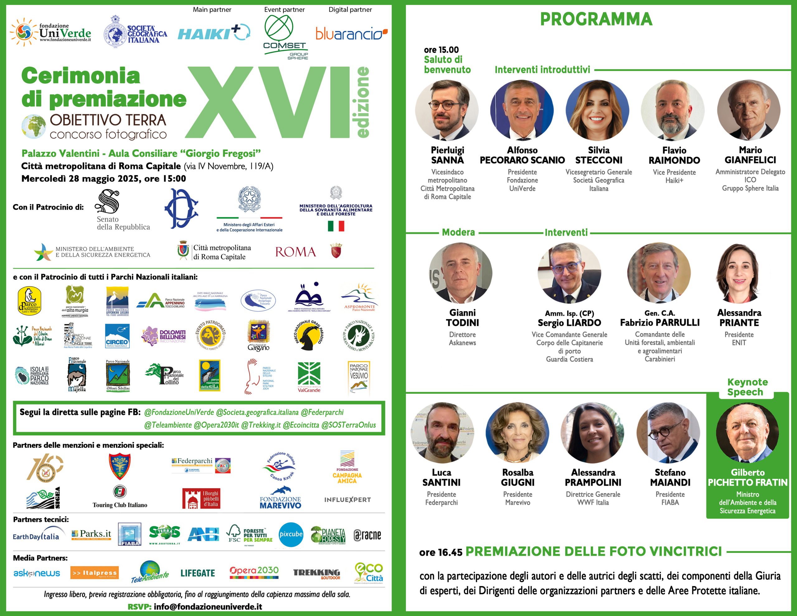 La Cerimonia di premiazione sarà ufficialmente aperta dal saluto di benvenuto di Pierluigi Sanna (Vicesindaco metropolitano della Città Metropolitana di Roma Capitale). Seguiranno gli interventi introduttivi dei promotori: Alfonso Pecoraro Scanio (Presidente della Fondazione UniVerde); Silvia Stecconi (Vicesegretario Generale della Società Geografica Italiana); Flavio Raimondo (Vice Presidente Haiki+); Mario Gianfelici (Amministratore Delegato ICO, Gruppo Sphere Italia). Si proseguirà con gli interventi di: Amm. Isp. (CP) Sergio Liardo (Vice Comandante Generale del Corpo delle Capitanerie di Porto - Guardia Costiera); Gen. C.A. Fabrizio Parrulli (Comandante delle Unità forestali, ambientali e agroalimentari dei Carabinieri); Alessandra Priante (Presidente ENIT); Luca Santini (Presidente Federparchi); Rosalba Giugni (Presidente Marevivo); Alessandra Prampolini (Direttrice Generale WWF Italia); Stefano Maiandi (Presidente Fiaba).